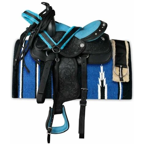 La selle western New Gen Pony de Silver Star est parfaite pour les jeunes cavaliers. Caractéristiques : Il est fabriqué en matière synthétique et en similicuir, avec des renforts en nylon. Il dispose d’un siège et d’étriers en daim pour un plus grand confort. Il est de couleur noire, avec des motifs floraux. Le siège, les étriers et le dessous sont de couleur turquoise ou rose. Il est orné de strass sur la tête de lecture qui le rendent unique. Cette selle est également fournie avec un bridon avec des rênes en nylon et un plastron, avec une housse en fourrure assortie au siège, une sangle en fourrure et un dessous de selle recouvert de tissu Navajo.