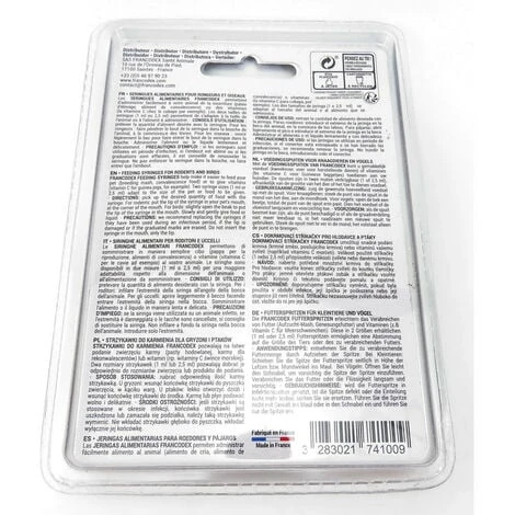 Les SERINGUES ALIMENTAIRES FRANCODEX permettent d’administrer facilement Ă votre animal de la nourriture (pâtĂ©e d’Ă©levage, aliment de convalescence) ou des vitamines (la vitamine C chez le cobaye par exemple).