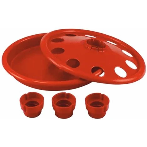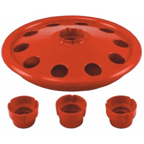 L’abreuvoir est composé de deux parties distinctes, qui s’emboîtent l’une dans l’autre. Dans le disque supérieur, il y a un trou central sur lequel on peut fixer la bouteille. L’abreuvoir à poussins est fourni avec 3 adaptateurs, chacun ayant un diamètre et un filetage différents, qui conviennent à différents types de bouteilles en plastique.