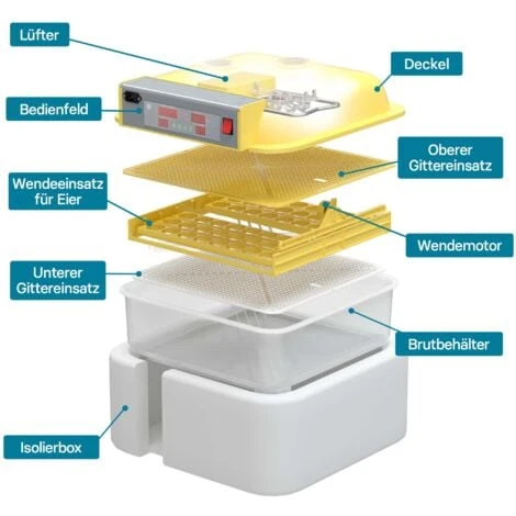 L’incubateur règle lors de l’incubation les processus suivants: le temps d’incubation, le retournement des œufs et une alarme vous prévenant de la divergence de température cible. La température, les intervalles de temps entre chaque retournement, et la durée de cuvée sont programmables.