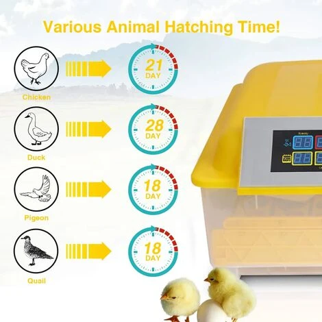 - Cette couveuse est conçue pour toutes sortes d’oeufs, tels que les oeufs de poulets, les oeufs de canards, les oeufs d’oie, les oeufs de dinde, etc.