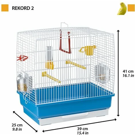 La cage pour canaris et petits oiseaux exotiques Rekord 2 a une forme rectangulaire traditionnelle, fabriquée en grillage métallique solide peint avec une poignée utile sur le dessus et un bac en plastique avec plateau amovible confortable pour faciliter le opérations de maintenance quotidiennes. La cage Rekord 2 est équipée d’accessoires pour être confortable pour votre compagnon : perchoirs, abreuvoir en plastique, mangeoire, pinces pour nourriture, balançoire, en plus de la mangeoire tournante Brava 1. Ces mangeoires vous permettent de nourrir facilement les oiseaux, elles peuvent être tournés à 180 degrés et remplis de nourriture de l’extérieur, sans laisser aucune ouverture et éviter ainsi que l’oiseau ne puisse s’échapper. Elles sont fabriquées entièrement en plastique transparent afin de pouvoir vérifier facilement le niveau d’alimentation disponible.
