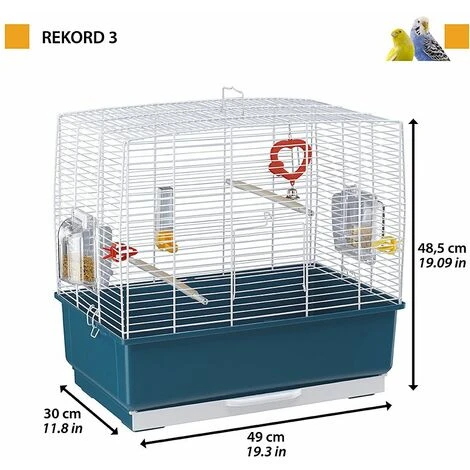 Rekord 3 est une cage rectangulaire classique idéale pour accueillir des canaris et des petits oiseaux exotiques. L’habitat est fabriqué en grillage métallique peint, et il est solide. La cage est équipée d’une poignée utile, le fond est en plastique avec plateau amovible maniable pour faciliter des opérations quotidiennes d’entretien. La cage Rekord 3 est équipée d’accessoires pour être confortable pour votre oiseau : perchoirs extensibles recouverts de caoutchouc antidérapant, abreuvoir en plastique, pinces pour la nourriture, jouet avec miroir et clochette, et mangeoires pivotantes Brava 2. Ces mangeoires permettent de nourrir facilement les oiseaux, elles peuvent être tournés à 180 ° et remplis de nourriture de l’extérieur, sans laisser aucune ouverturepour éviter que l’oiseau ne s’échappe. Elles sont entièrement en plastique transparent afin que vous puissiez vérifier facilement le niveau d’alimentation disponible.