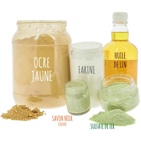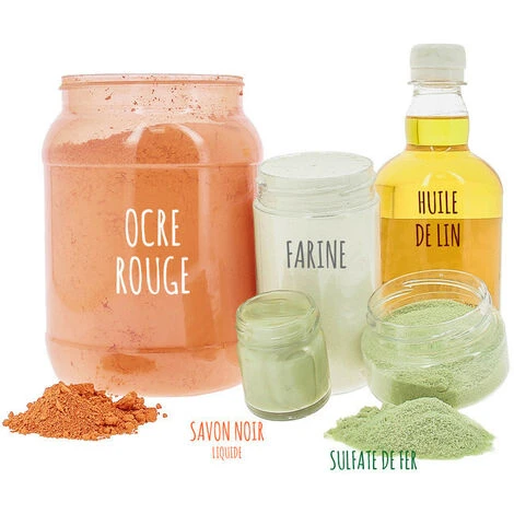 Il est composé de 500 ml d’huile de lin extraite par première pression à froid (protège le bois de l’humidité et des champignons), de 260 g de farine de blé (utilisé par l’artisanat de l’habitat sain depuis très longtemps), de 40 ml de savon noir 100% naturel, de 100 g de sulfate de fer et de 1kg de pigments ocre d’origine française (résistants et très bon pouvoir de coloration).
