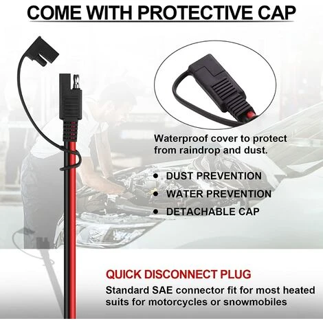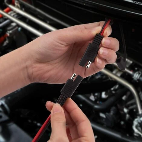 Rallonge à 2 broches avec connecteur universel SAE, peut être largement utilisée dans tous les types de véhicules et d’appareils, tels que l’automobile, la moto, la tondeuse à gazon, le camping-car, le moteur de pêche à la traîne, le VTT, le kayak, le pulvérisateur de tracteur, l’onduleur et d’autres appareils avec ports sae.
