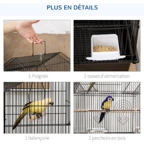 – 2 mangeoires, 2 perchoirs et balançoire inclus permettant à vos oiseaux de se reposer, se bercer, s’alimenter