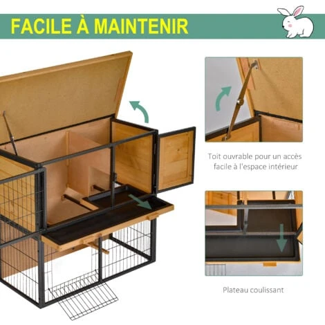 – 3 portes, toit ouvrant, tiroir à déjection coulissant afin de vous faciliter l’entretien de votre clapier : hygiène et bien-être optimum de vos lapins