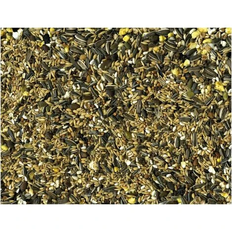 Sarrasin, graines de tournesol striées petites, blé, graines de tournesol blanc grandes, riz paddy, graines de cardy, avoine pelée, graines de chanvre, avoine, raisins secs, noix de cèdre, maïs soufflé, blé soufflé, graines de citrouille pelées, sorgho, millet – blanc, alpiste, graines de lin