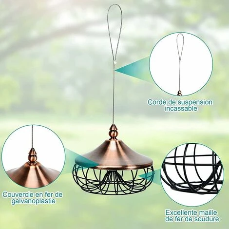 Couverte d’une protection de placage et de pulvérisation, notre mangeoire est doté d’une bonne durabilité et une bonne résistance à la rouille. La clôture métallique empêche les écureuils de manger et l’espacement approprié permet aux oiseaux de manger de toutes les directions. Le couvercle métallique est facile à ouvrir pour ajouter des nourritures, il protège les aliments de l’humidité en évitant que les aliments ne soient trempés par l’eau de pluie.