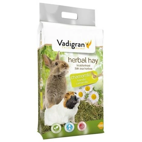 Foin de fleurs camomille 500g Foin enrichi de fleur de camomille. ComplĂ©ment alimentaire indispensable pour assurer un parfait transit intestinal. La camomille a, entre autres. propriĂ©tĂ©s sĂ©datives (PET se sentir mieux), et antiseptiques. Ă€ distribuer en alternant avec du foin pur. Toujours laisser de l’eau Ă disposition.