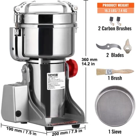 - Broyeur a Sec Polyvalent : Le moulin a cereales electrique peut traiter diverses matieres seches, notamment ① les cereales (soja, maïs, orge, ble, avoine, seigle, pois, grains de cafe), ② les epices (fenouil, poivre, cannelle, romarin) ③ les herbes (lorsque vous broyez des herbes medicinales et deautres produits durs, veuillez deabord les decouper en petits morceaux). Il est souvent utilise dans les familles, les cuisines, les hopitaux et les usines de traitement des medicaments.