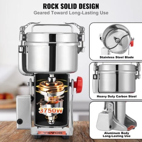 - Materiau en Inox & Conceptions de Securite : Le petit moulin a epices est fabrique en acier inoxydable de qualite alimentaire, durable et non polluant. La structure de la boucle offre une bonne etancheite et une capacite de haute securite. Le broyeur de cereales commercial sarrete automatiquement lorsque le couvercle est ouvert, ce qui renforce la securite et protege lutilisateur contre les blessures. Lorsqu’il est surcharge, le dispositif de protection contre les surcharges fonctionne automatiquement pour controler le fonctionnement.