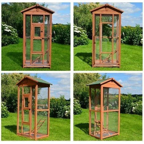 La volière à oiseaux spacieuse Modèle L en bois résineux vitrifié et résistant aux intempéries offre suffisamment d’espace pour plusieurs oiseaux, qui peuvent également décoller pour de petits vols.