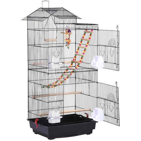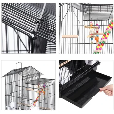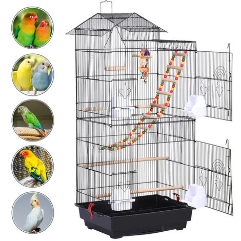 - Cage oiseaux en métal peint, PP, bois, non toxique, noir
