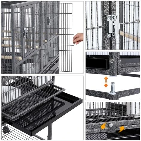 Construction métallique robuste: Construite en fer forgé de qualité avec un revêtement de peinture martelé durable et résistant, cette cage oiseaux divisée est sans danger pour vos animaux de compagnie et suffisamment robuste pour qu’ils puissent mâcher.