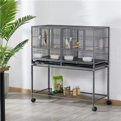 Support roulant détachable: Fondé sur quatre roues pivotantes à 360 degrés (deux avec freins), cette large cage à oiseaux peut être roulée sans effort. La cage supérieure peut être utilisée séparément grâce à la conception détachable.