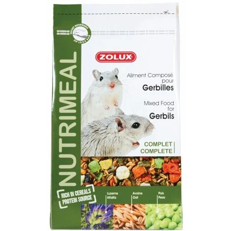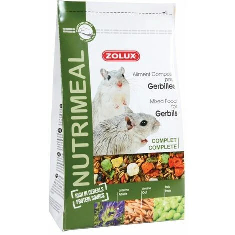Les aliments complets Nutrimeal, spécialement étudiés pour l’alimentation quotidienne des rongeurs, offrent un mélange de saveurs, de couleurs et de textures qui stimuleront et raviront votre animal. Sachet hermetique et zippé sous atmosphère azotée préservant ainsi les aliments de toutes intrusions d’insectes et garantissant la préservation de leurs qualités nutritionnelles. Conçu spécifiquement pour les gerbilles, ce mélange complet est constitué de granulés (avoine, luzerne) et de pois. Composition : Céréales 55%, Granulés (Céréales, Fourrages, Oléagineux, Tubercules et Racines, Minéraux), Légumineuses, Fourrages, Tubercules et racines, Oléagineux, Fruits. Composition Analytique : Protéine brute 11,68%, Matière grasse 3,60%, Cendre brute 4,30%, Cellulose 9,60%, Humidité 11,90%